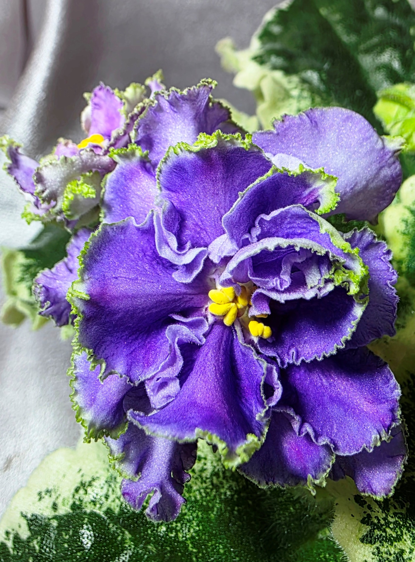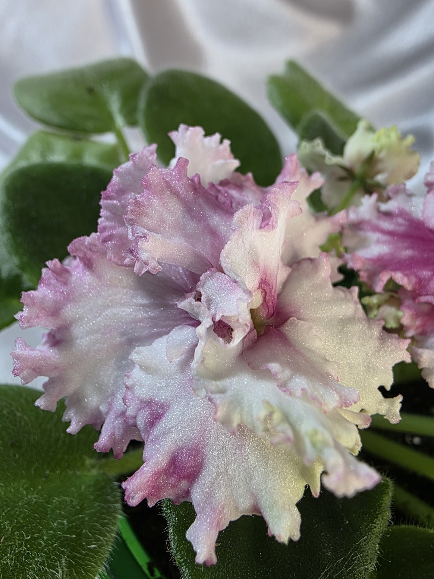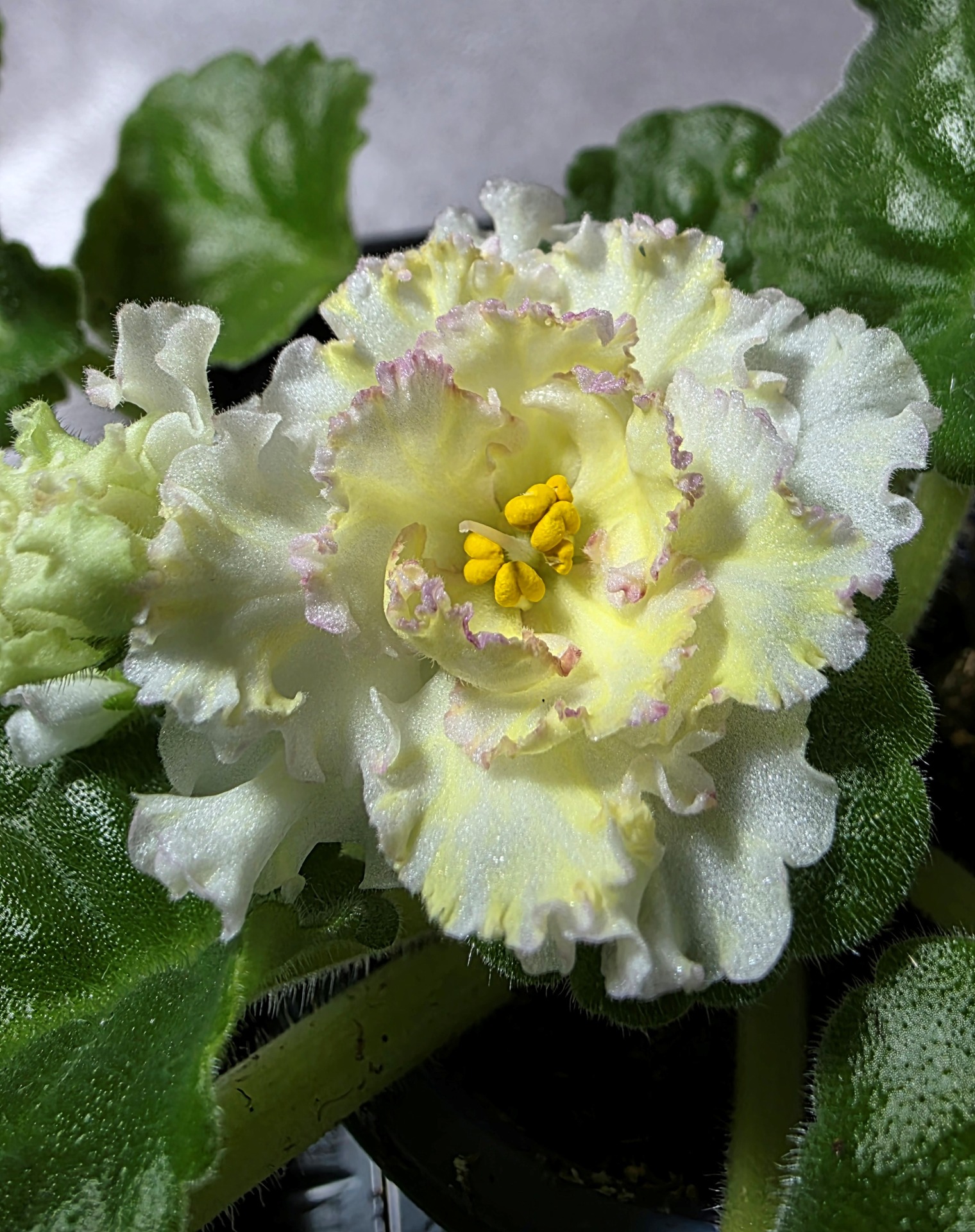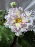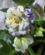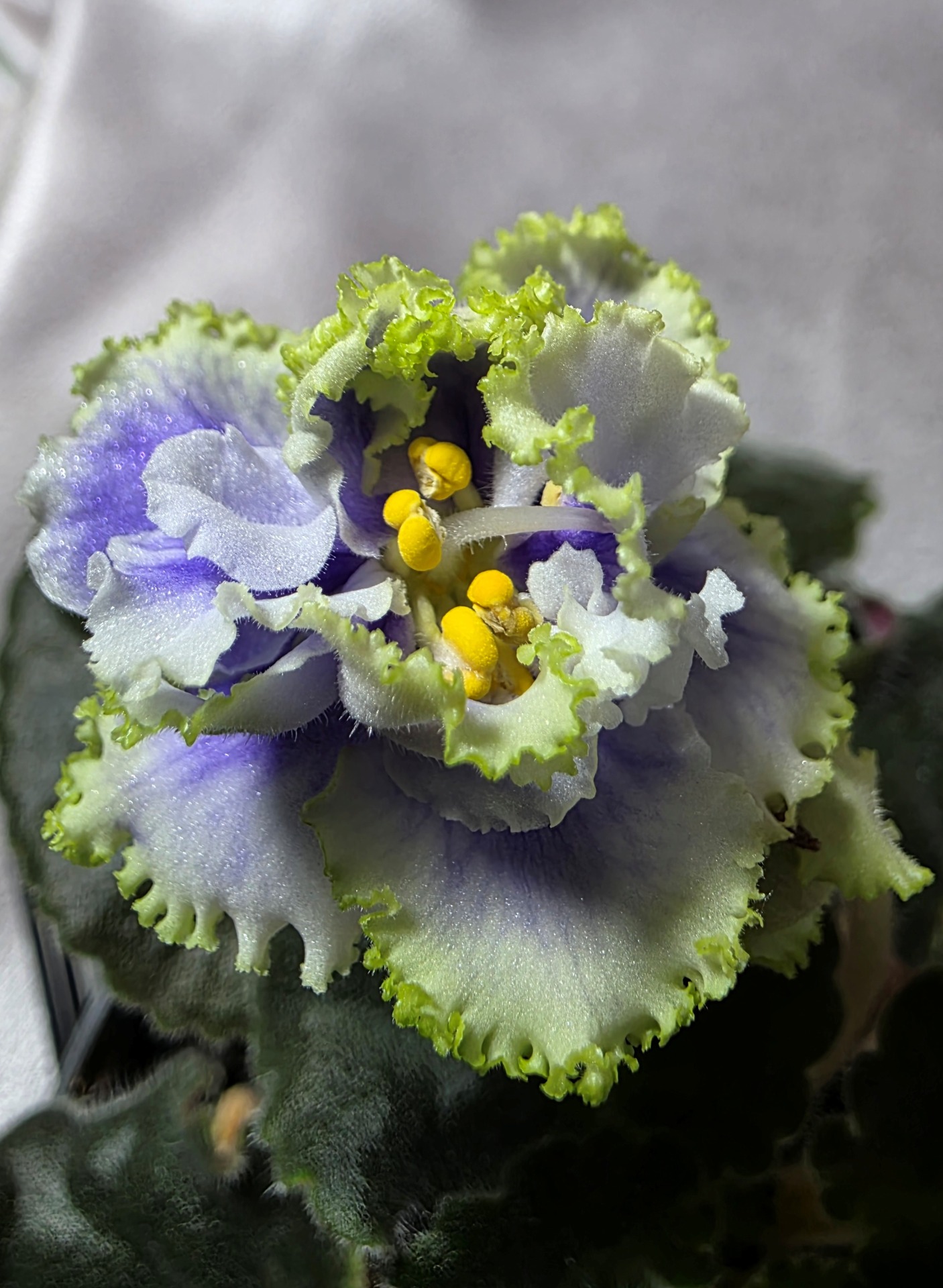Розетка цветка ровная, стандартного размера, листья волнистые, светло-зеленые. Цветки яркие, волнистые, крупные, имеют белые лепестки с яркой зелёной рюшкой и фиолетовым напылением.