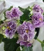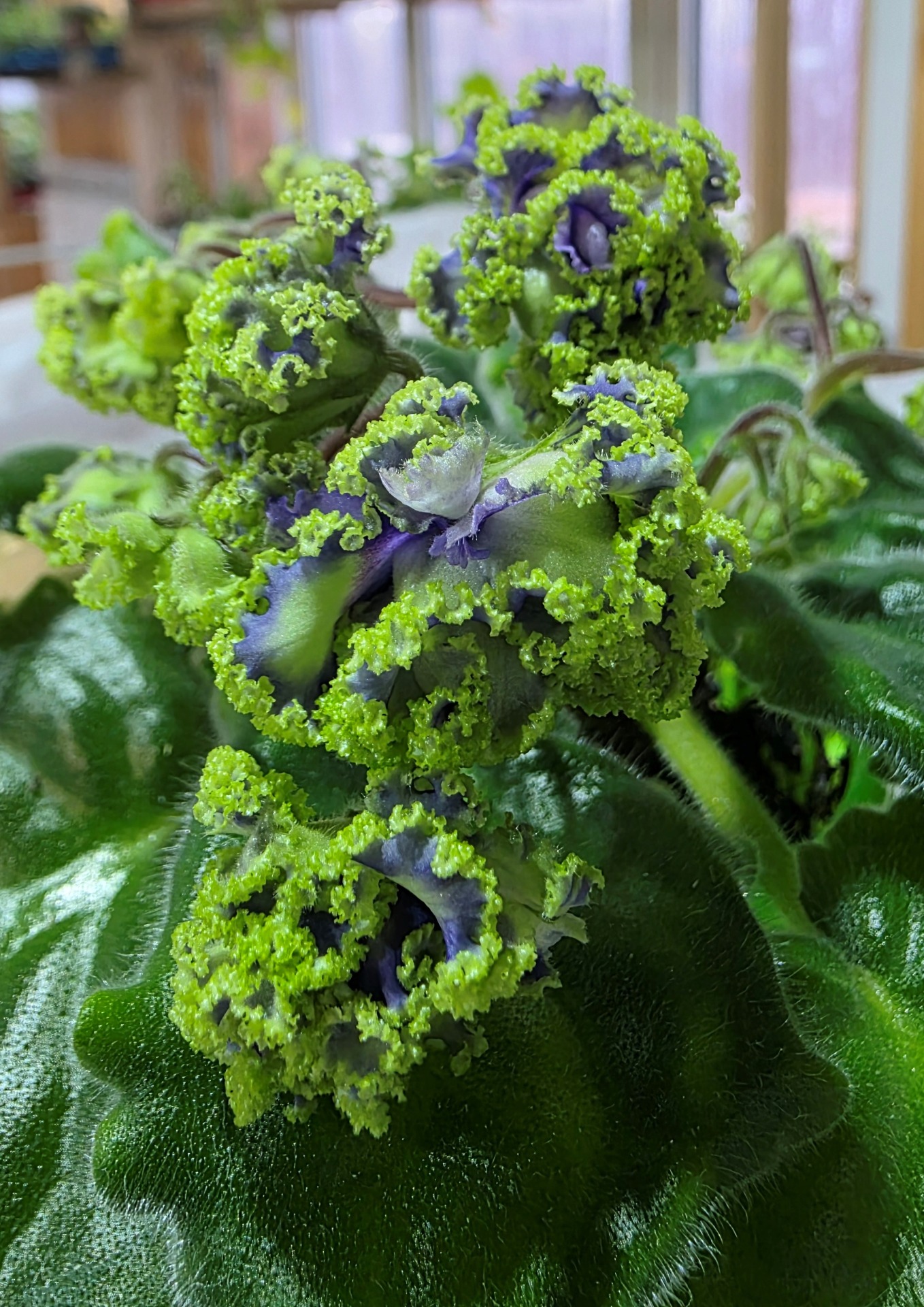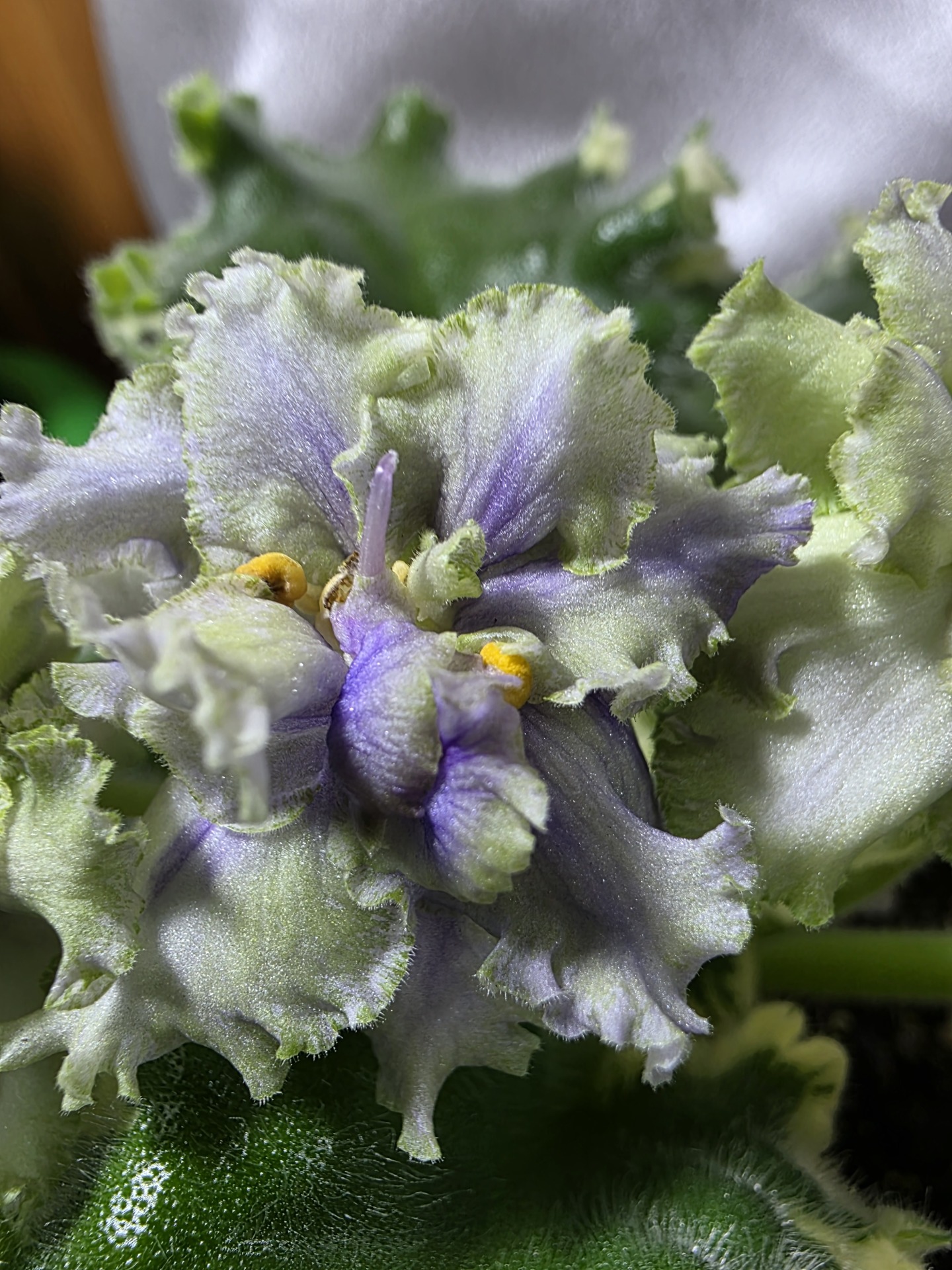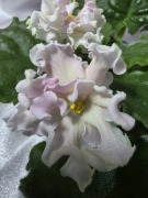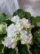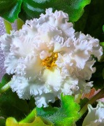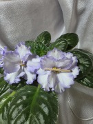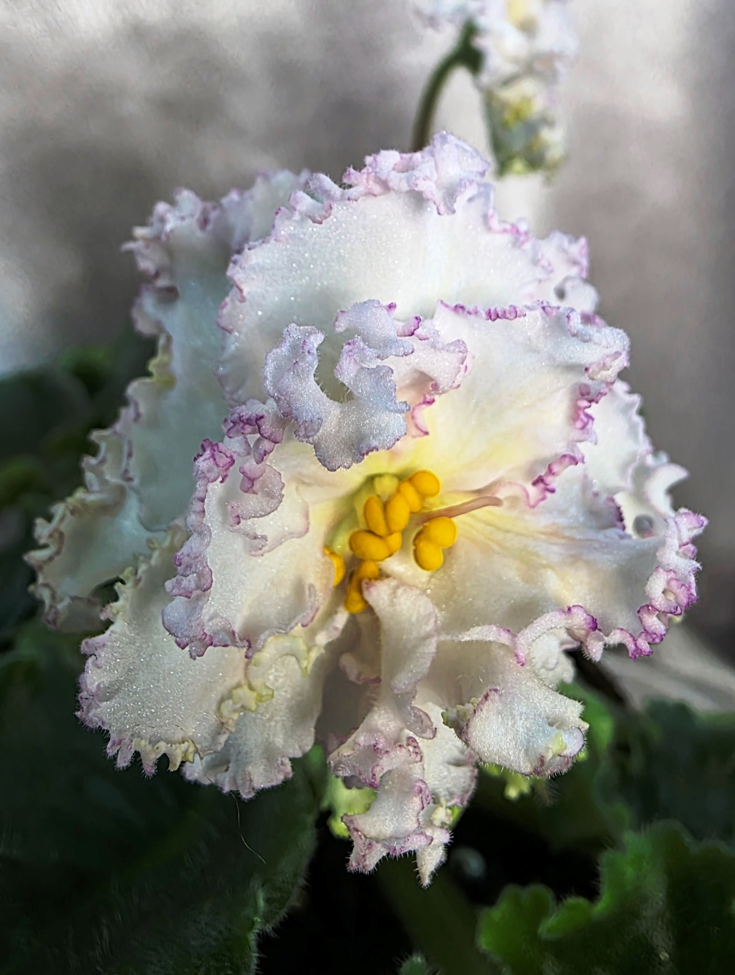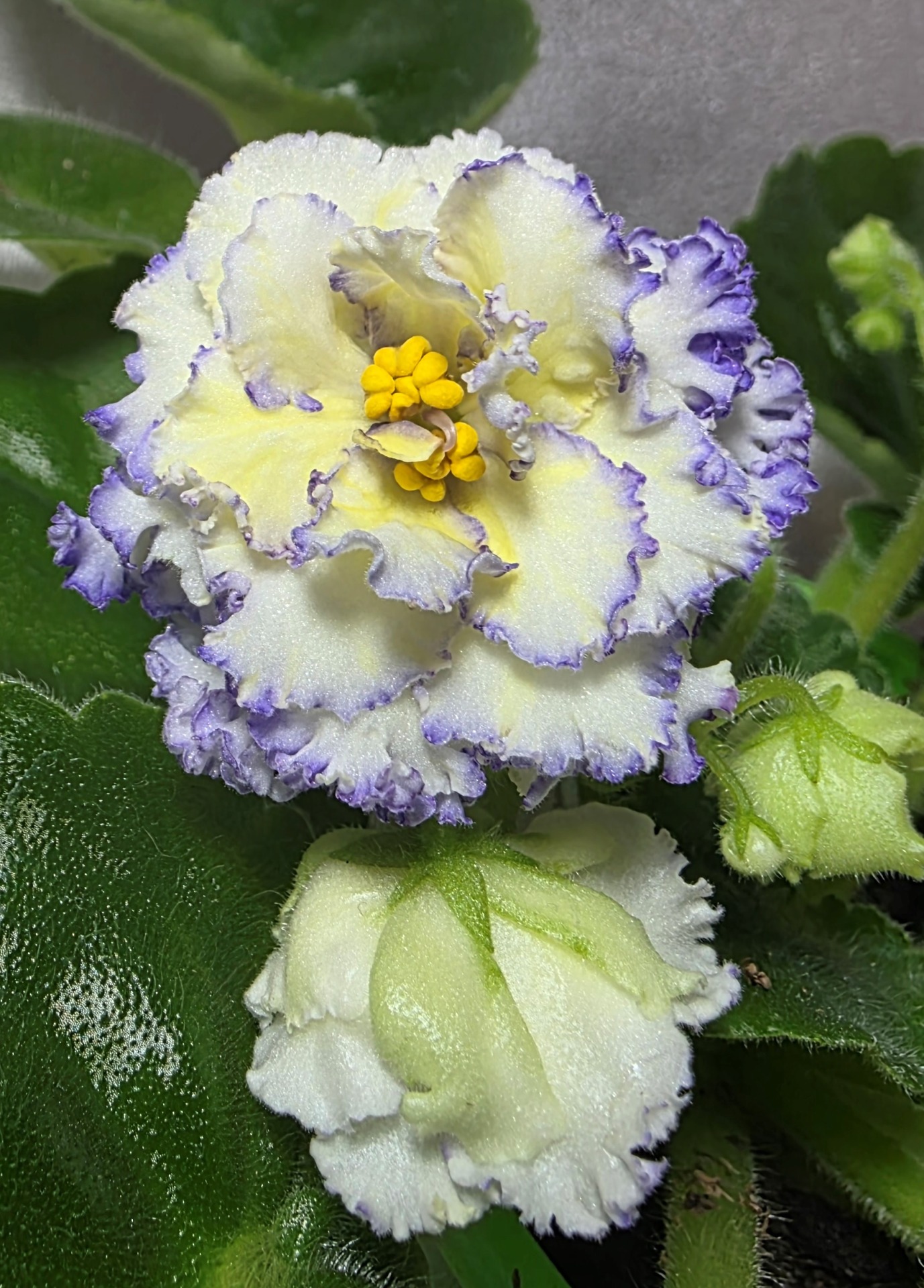 Розетка цветка ровная, стандартного размера, листья волнистые, светло-зеленые. Цветки яркие, волнистые, крупные, имеют белые лепестки с яркой зелёной рюшкой и фиолетовым напылением.