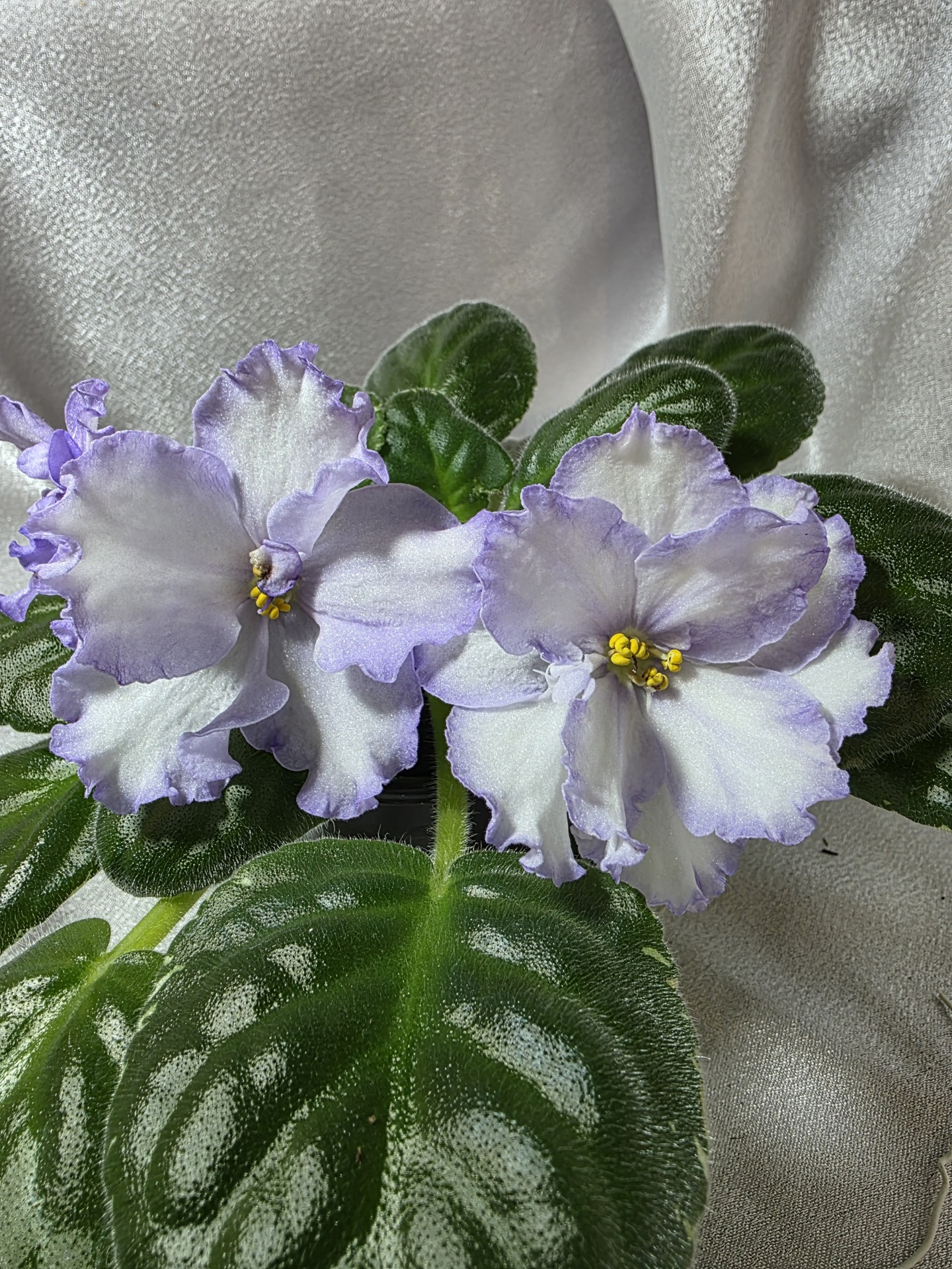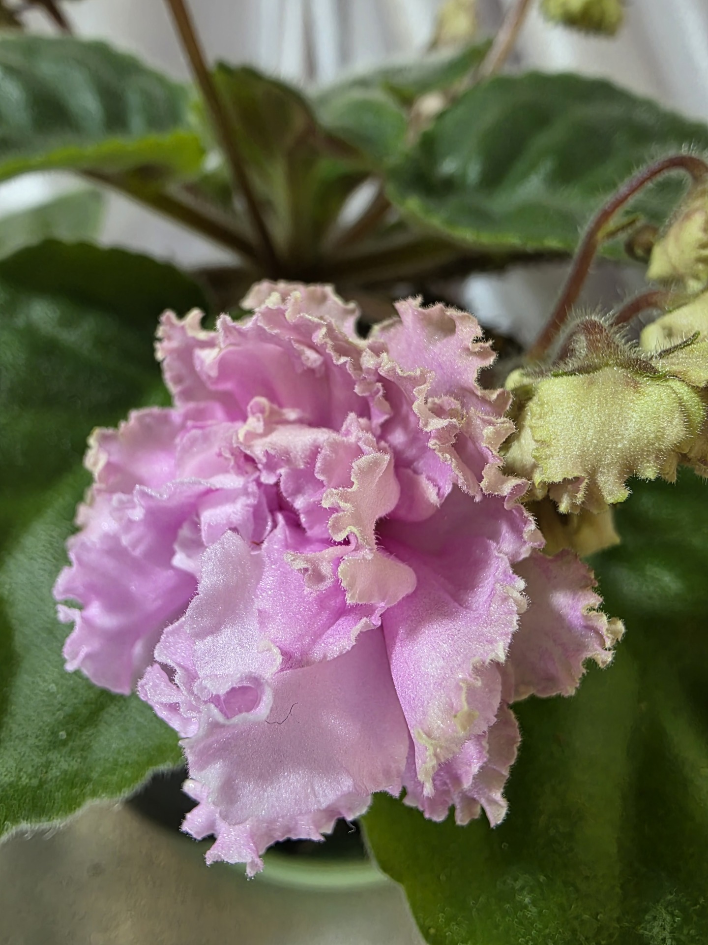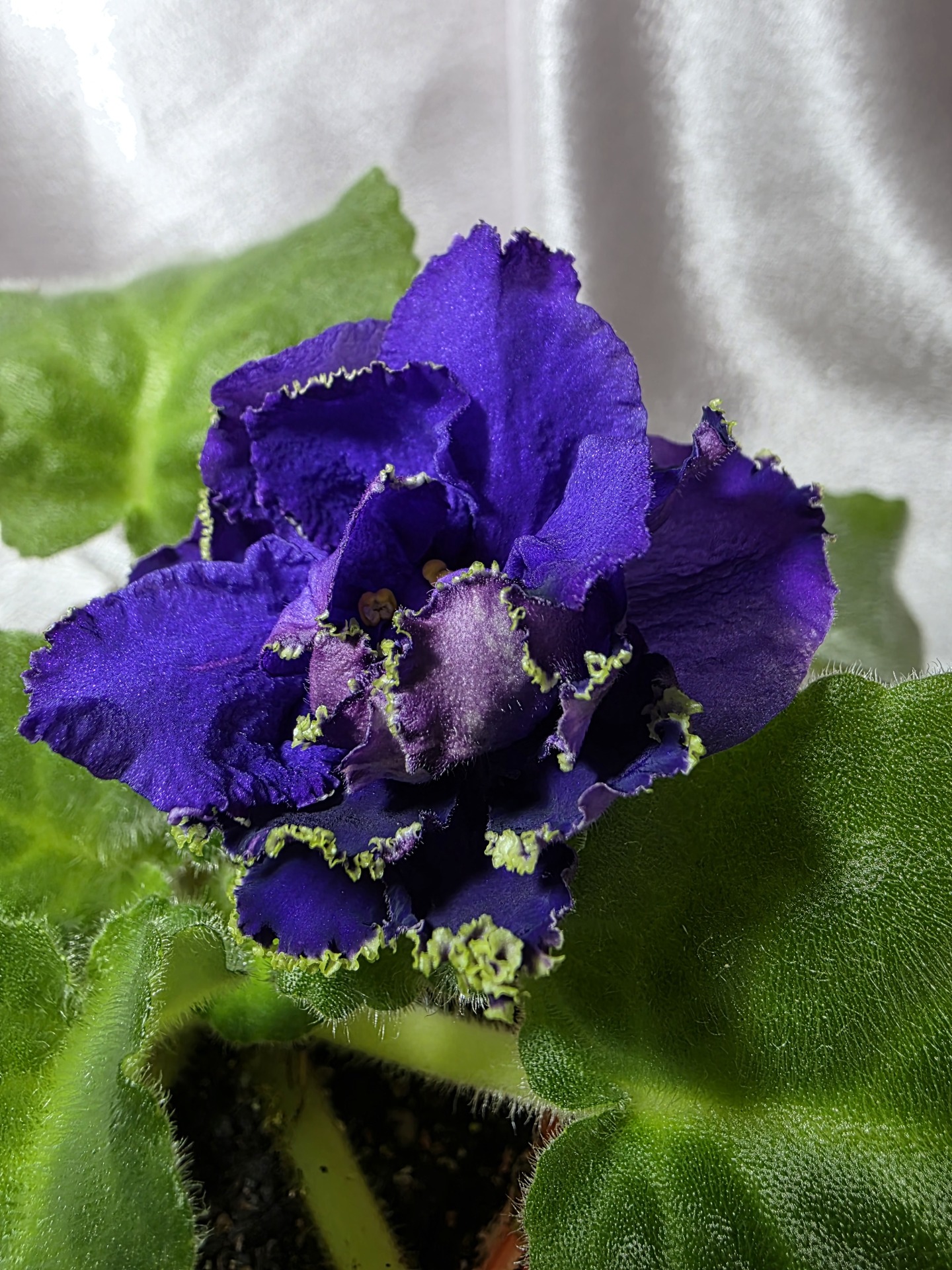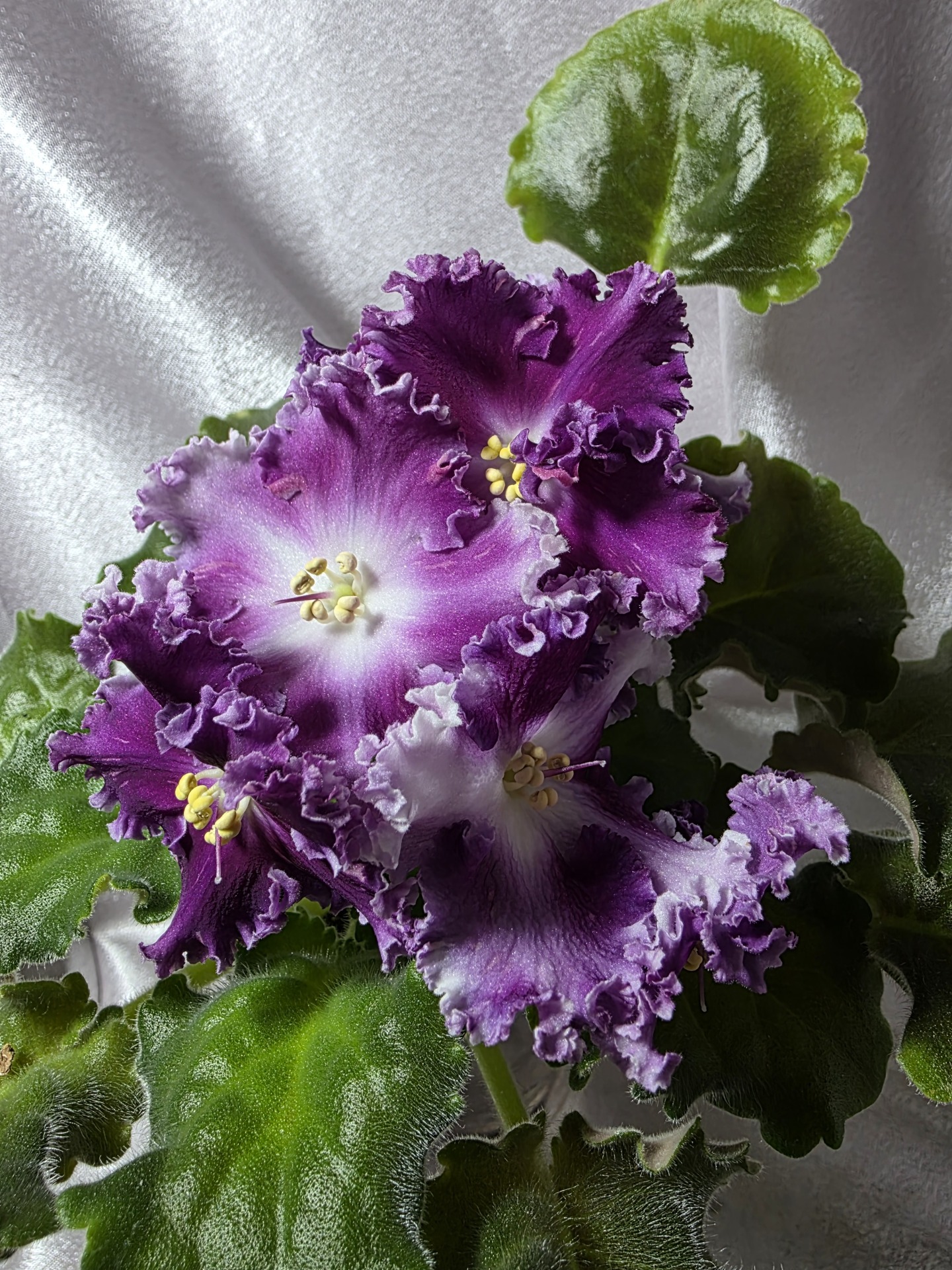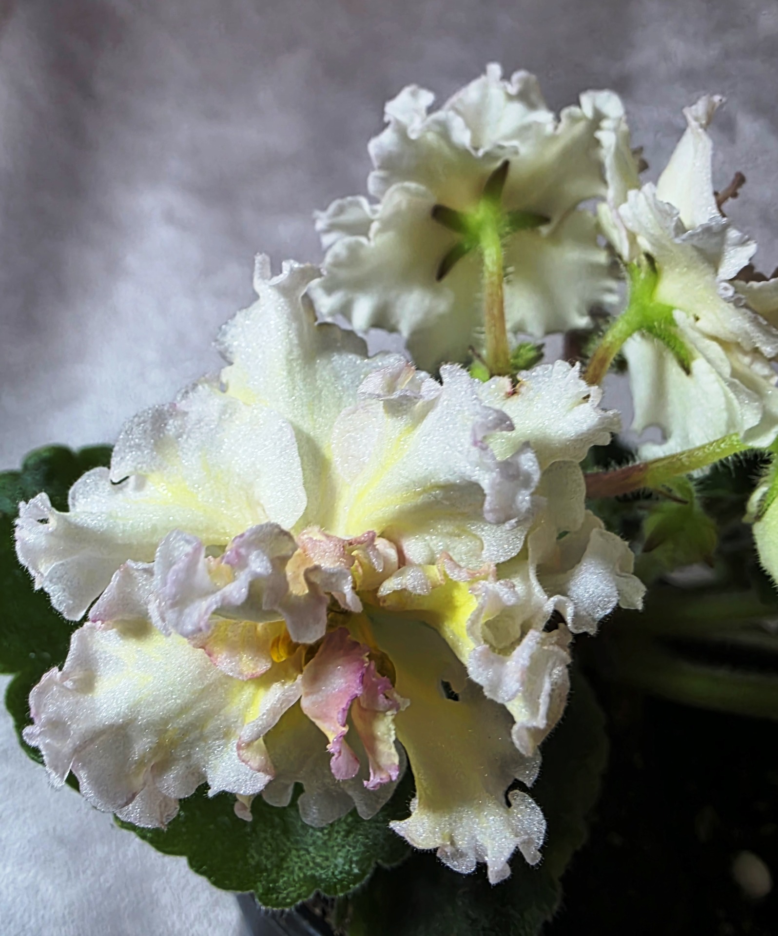 Розетка цветка ровная, стандартного размера, листья волнистые, светло-зеленые. Цветки яркие, волнистые, крупные, имеют белые лепестки с яркой зелёной рюшкой и фиолетовым напылением.
