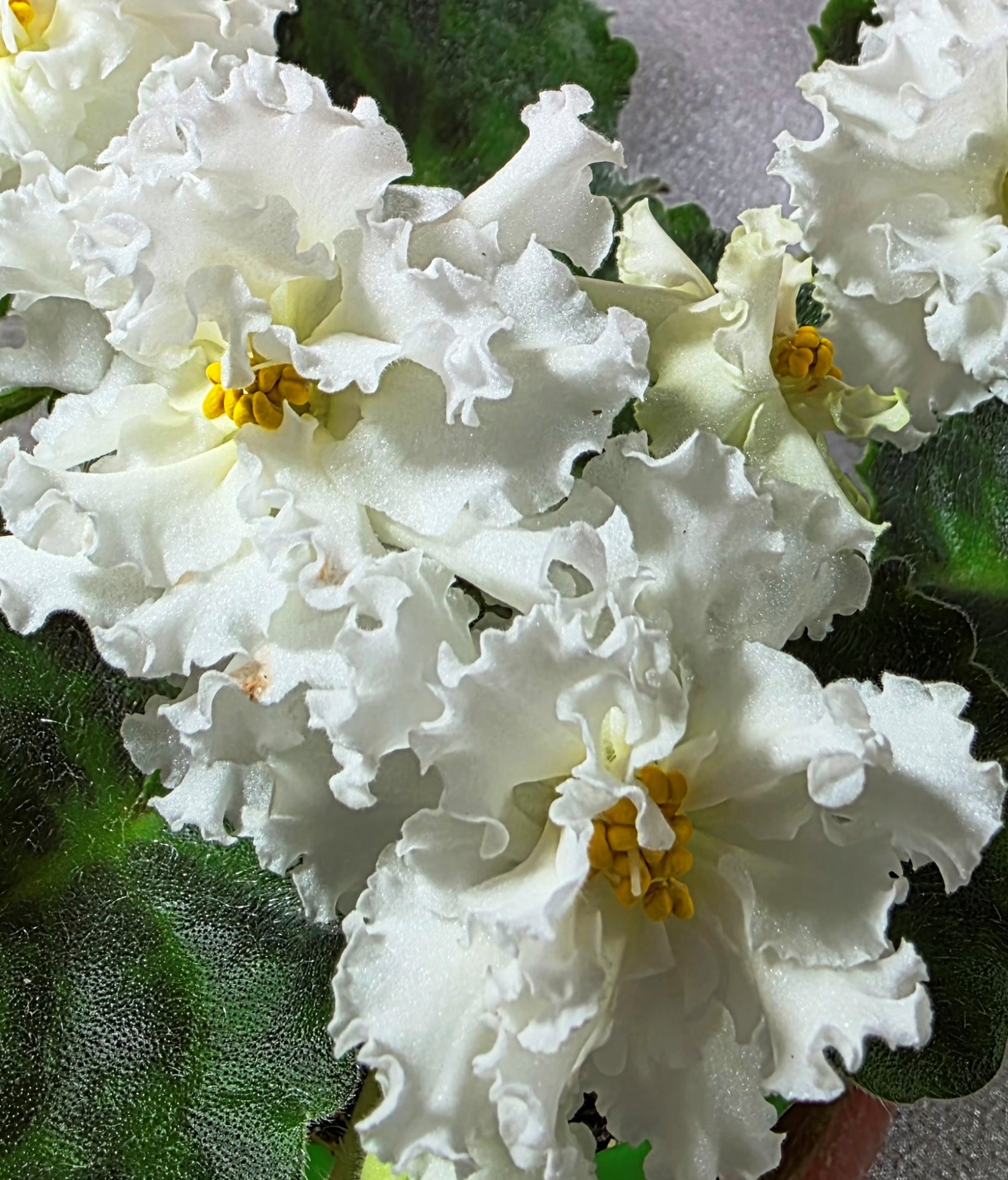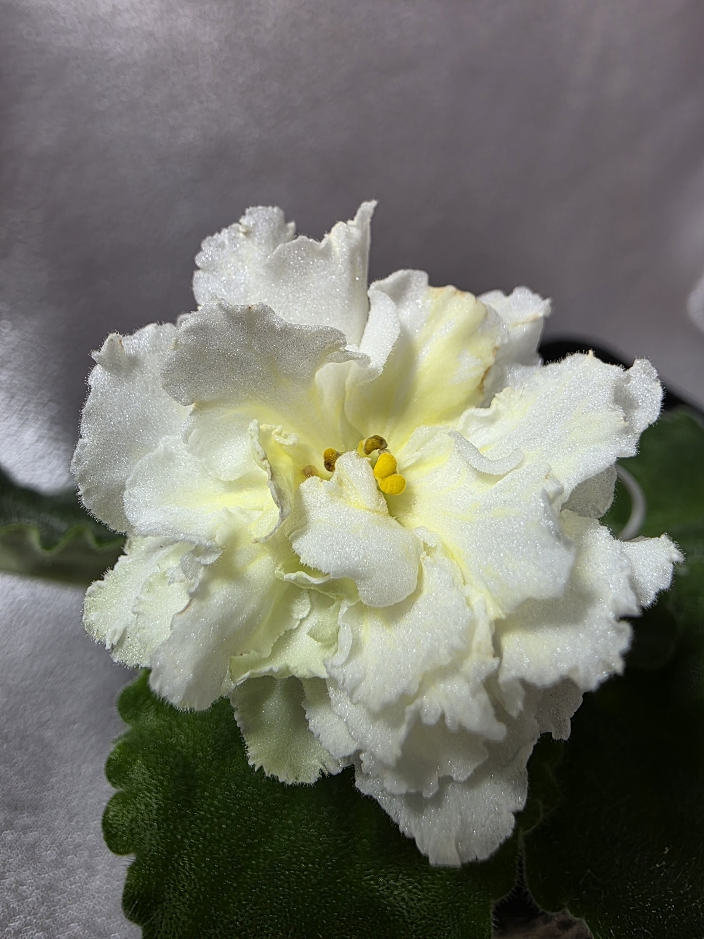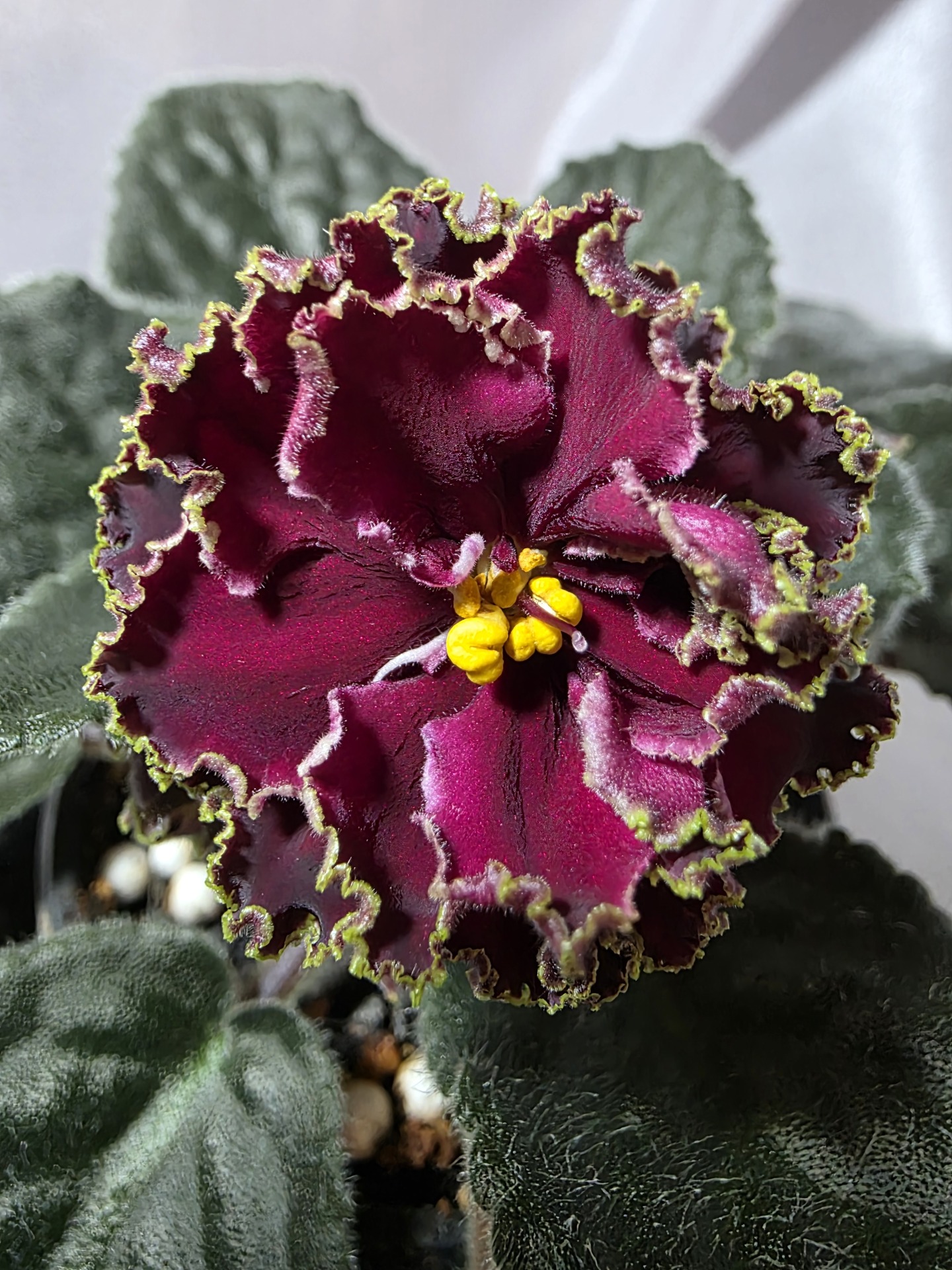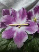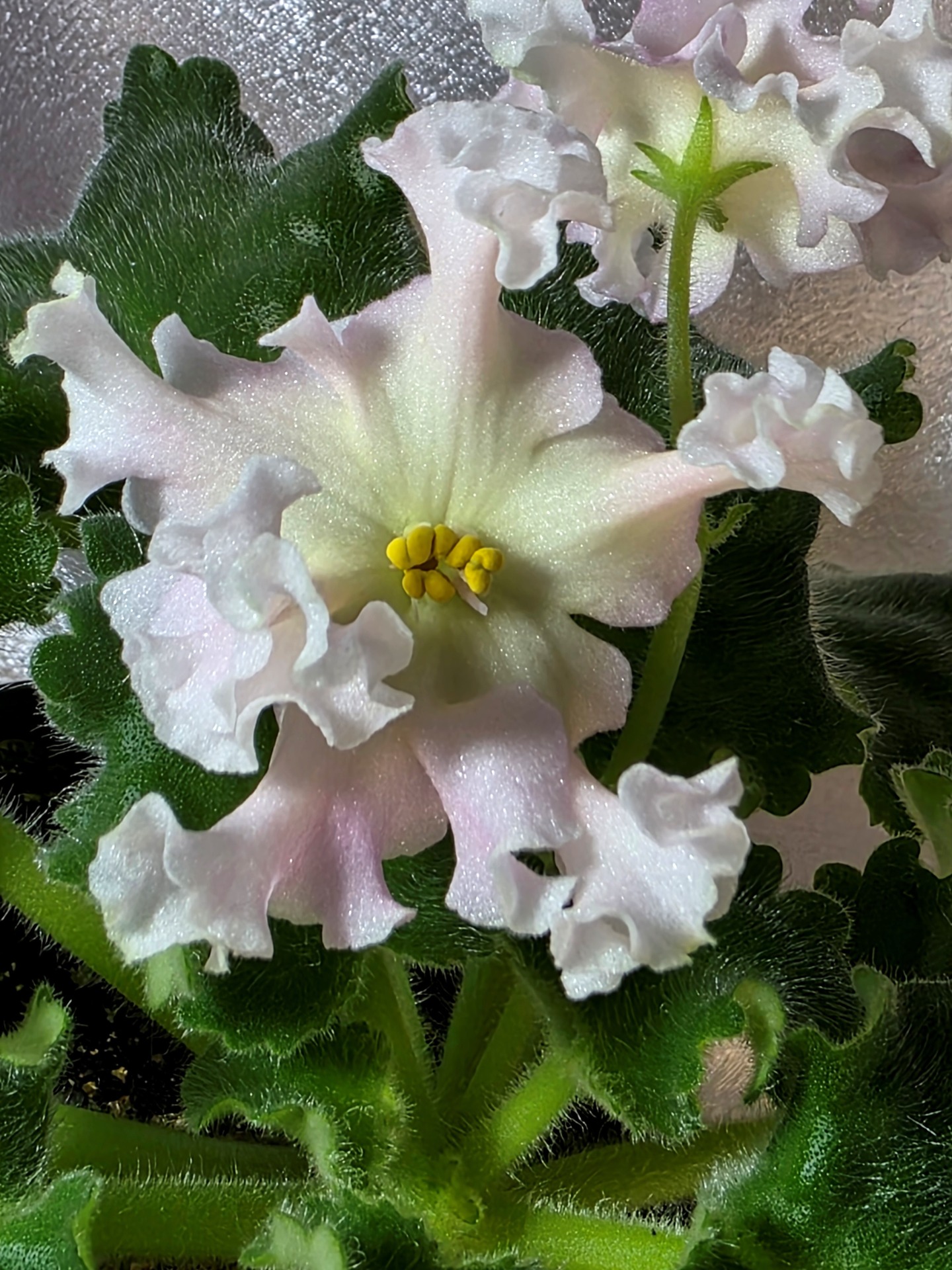 Розетка цветка ровная, стандартного размера, листья волнистые, светло-зеленые. Цветки яркие, волнистые, крупные, имеют белые лепестки с яркой зелёной рюшкой и фиолетовым напылением.