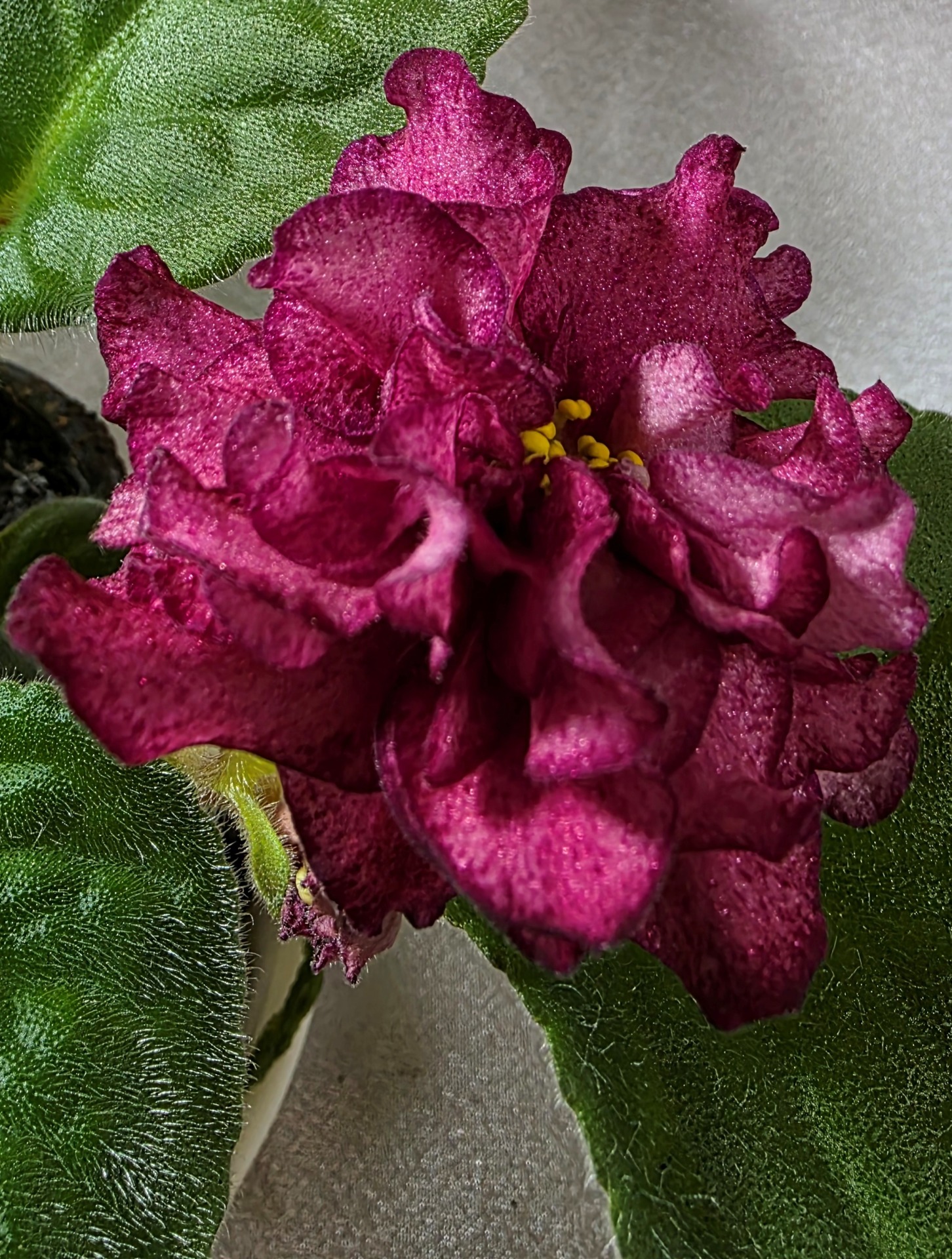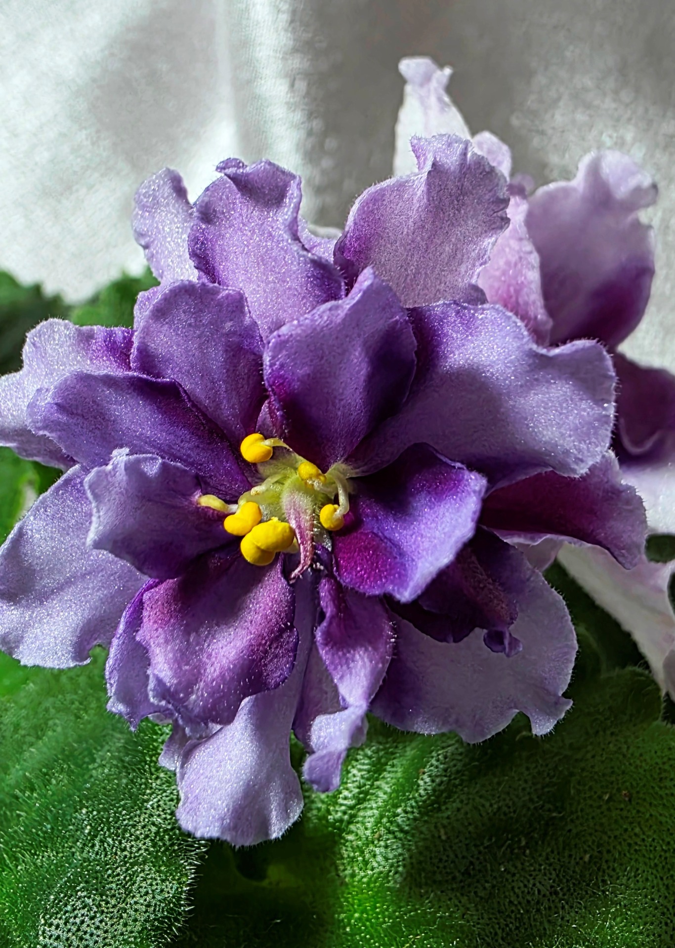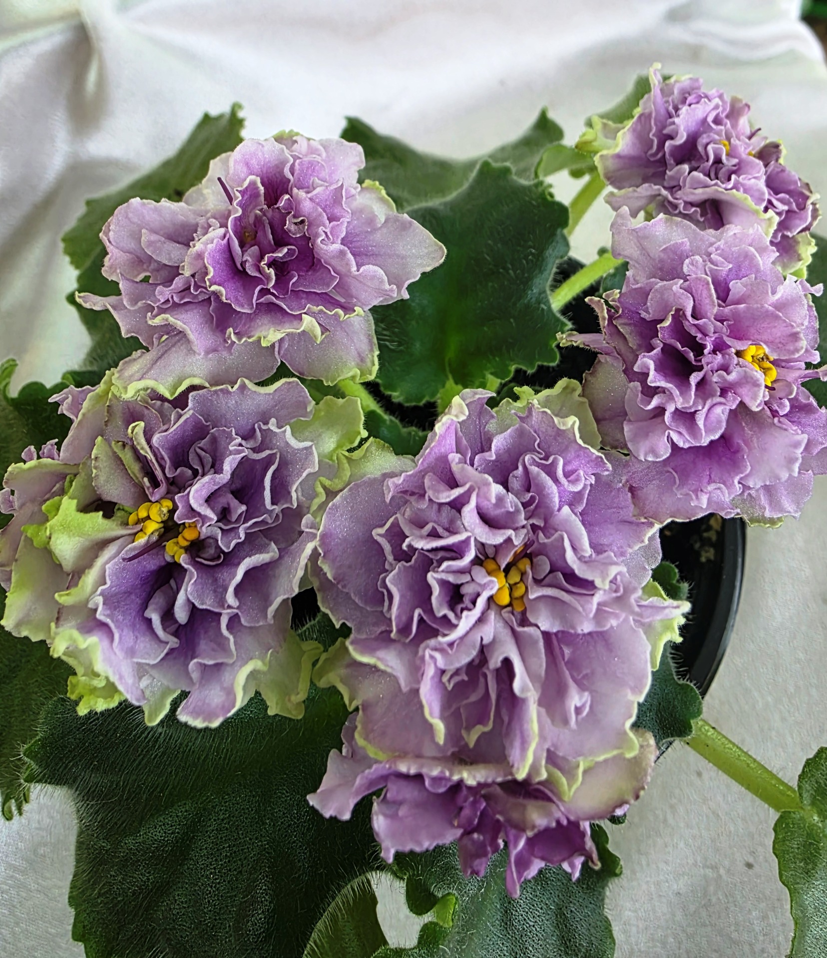 В розетку «Вавилона» входит умеренно-зеленая листва. Размер растения позволяет отнести его к стандартной группе. Когда начинается второе цветение, его пышность существенно увеличивается. На кожистых листьях имеется много мелких ворсинок. Розетка достигает довольно большой величины. Юная листва на краях немного подвернута. В ходе развития она выпрямляется. У взрослых цветов листья напоминают овал.