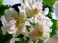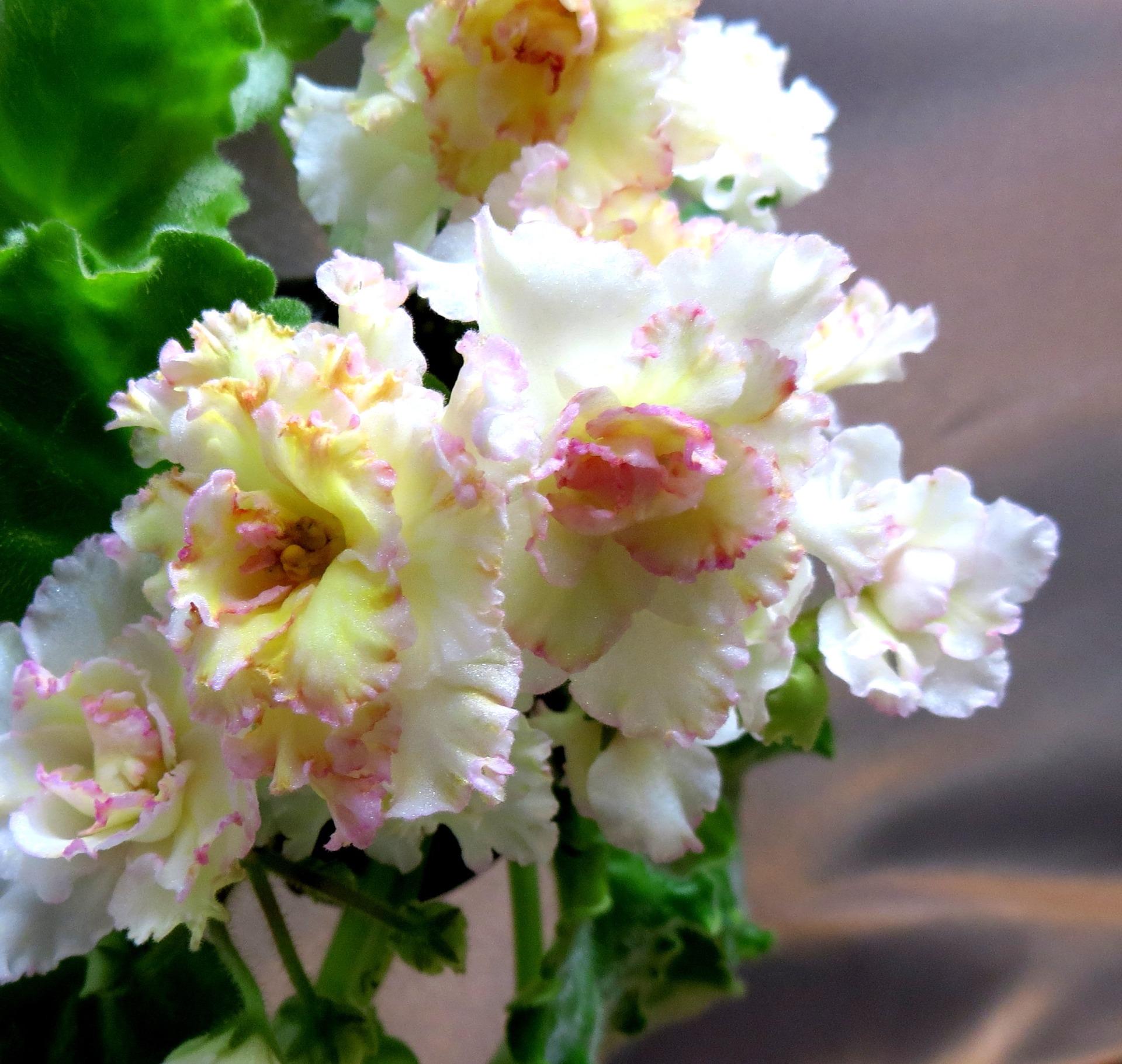 Цветок окрашен в белый цвет с жёлтым центром и розовой окантовкой. Цветонасыщенность полностью раскрывшегося бутона – яркая, по типу окраса цветок похож на трёхцветный. Окантовка не сплошная, окрашена в розовый оттенок. Махровость бутона обычная, по размеру он средний. Цветки на одном стебле собраны в соцветия.