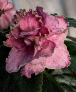 Очень крупные, полумахровые цветы, необычного палево-розового цвета с земляничной каймой напыления и такого же цвета штрихов по всему цветку, в прохладных условиях проявляется зеленоватая каёмочка. Хорошие цветоносы, обильное цветение. Розетка из тёмно зелёных листьев. Супер сорт! Новинка 2018