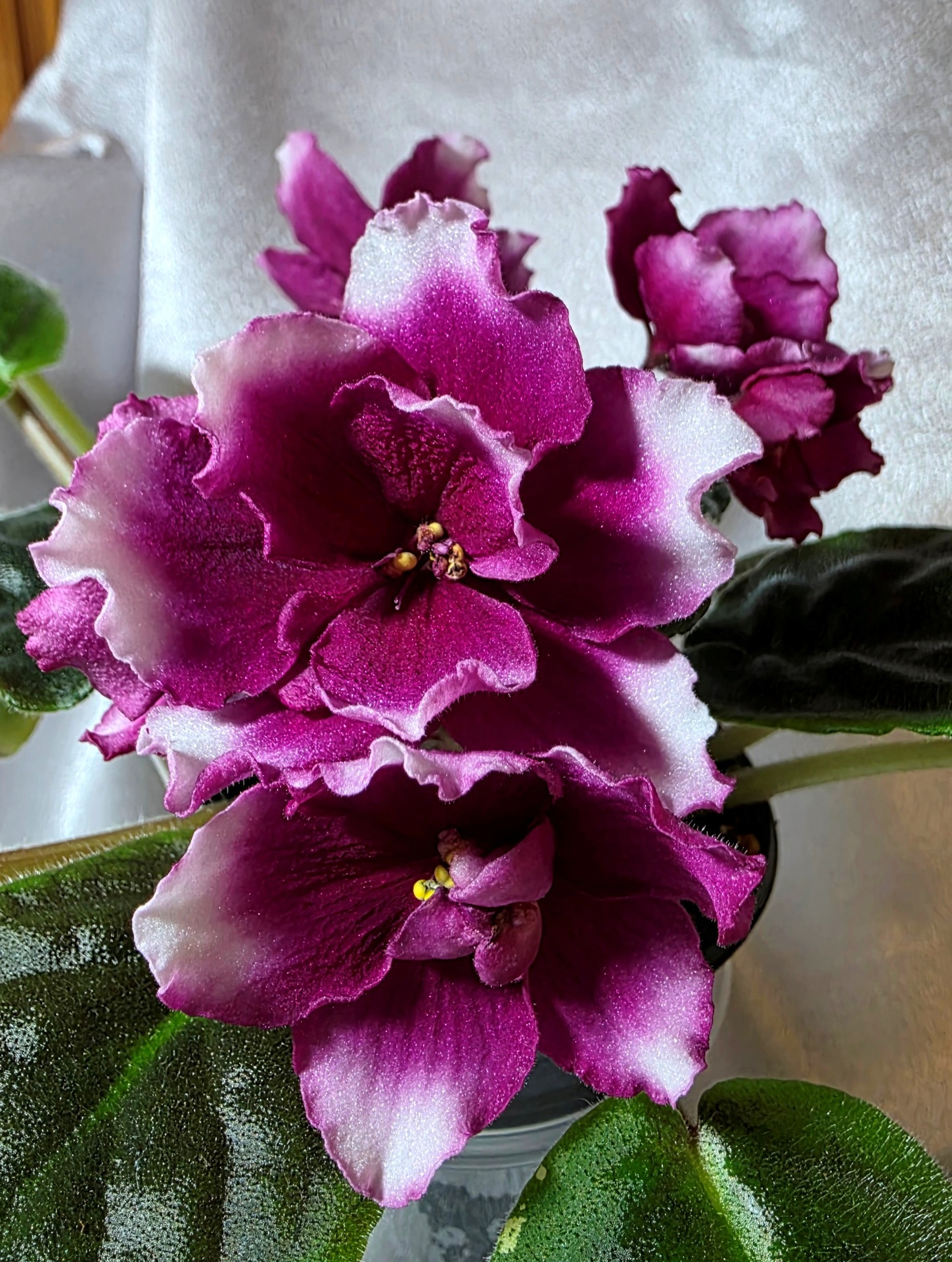 Простые и полумахровые ярко фиолетовые цветы с рубиновым фэнтази в виде сигментов разного размера, красивая пестролистная листва. Шапочное цветение. Стандарт. (2020г)