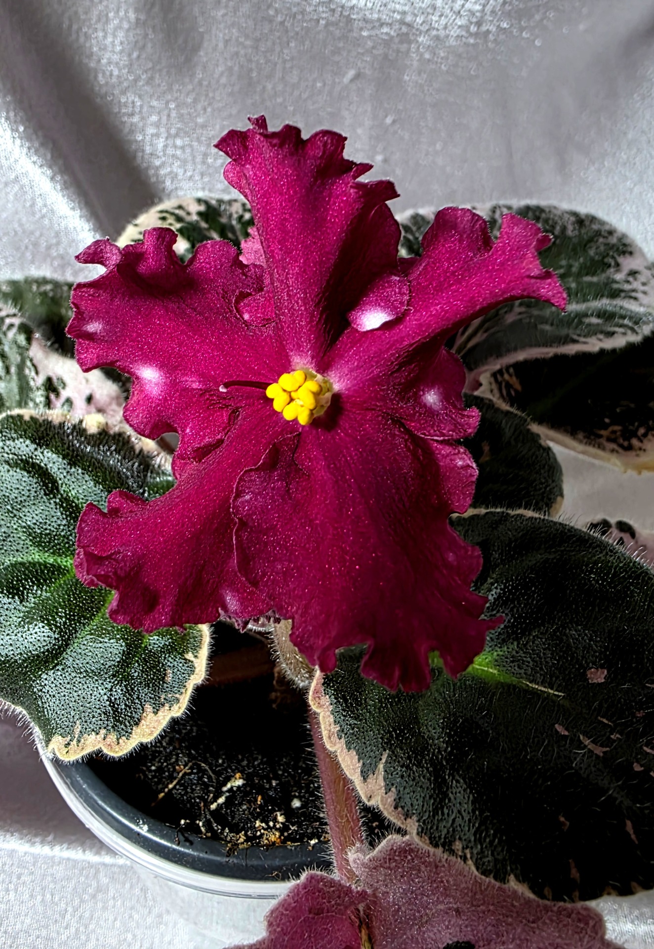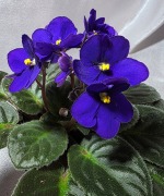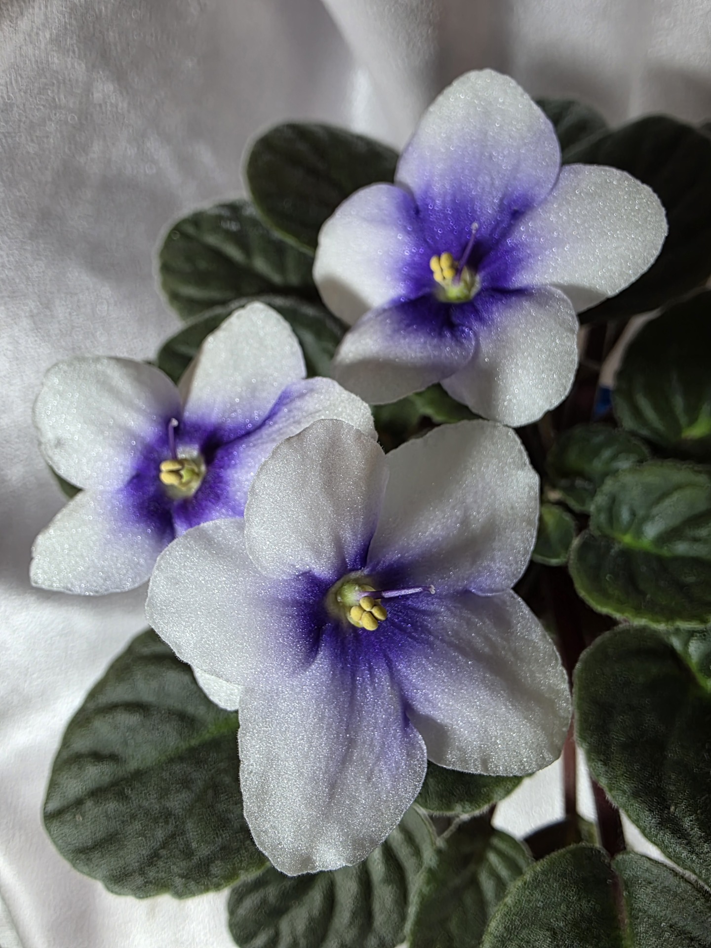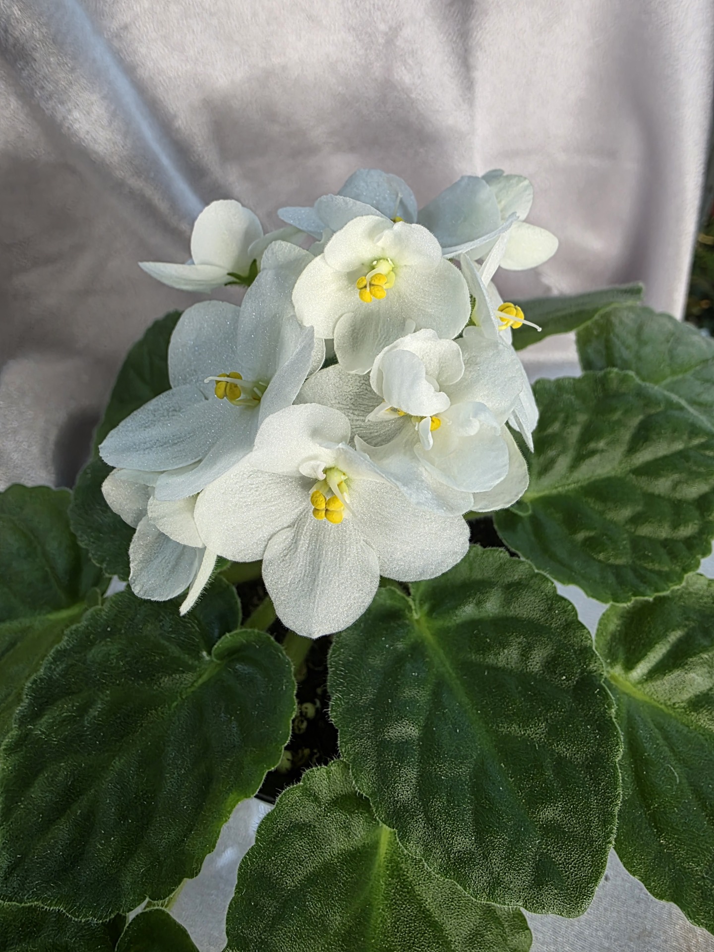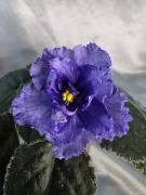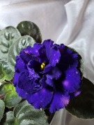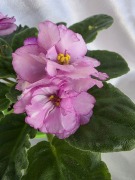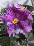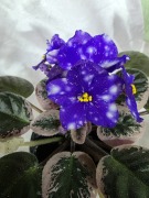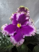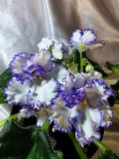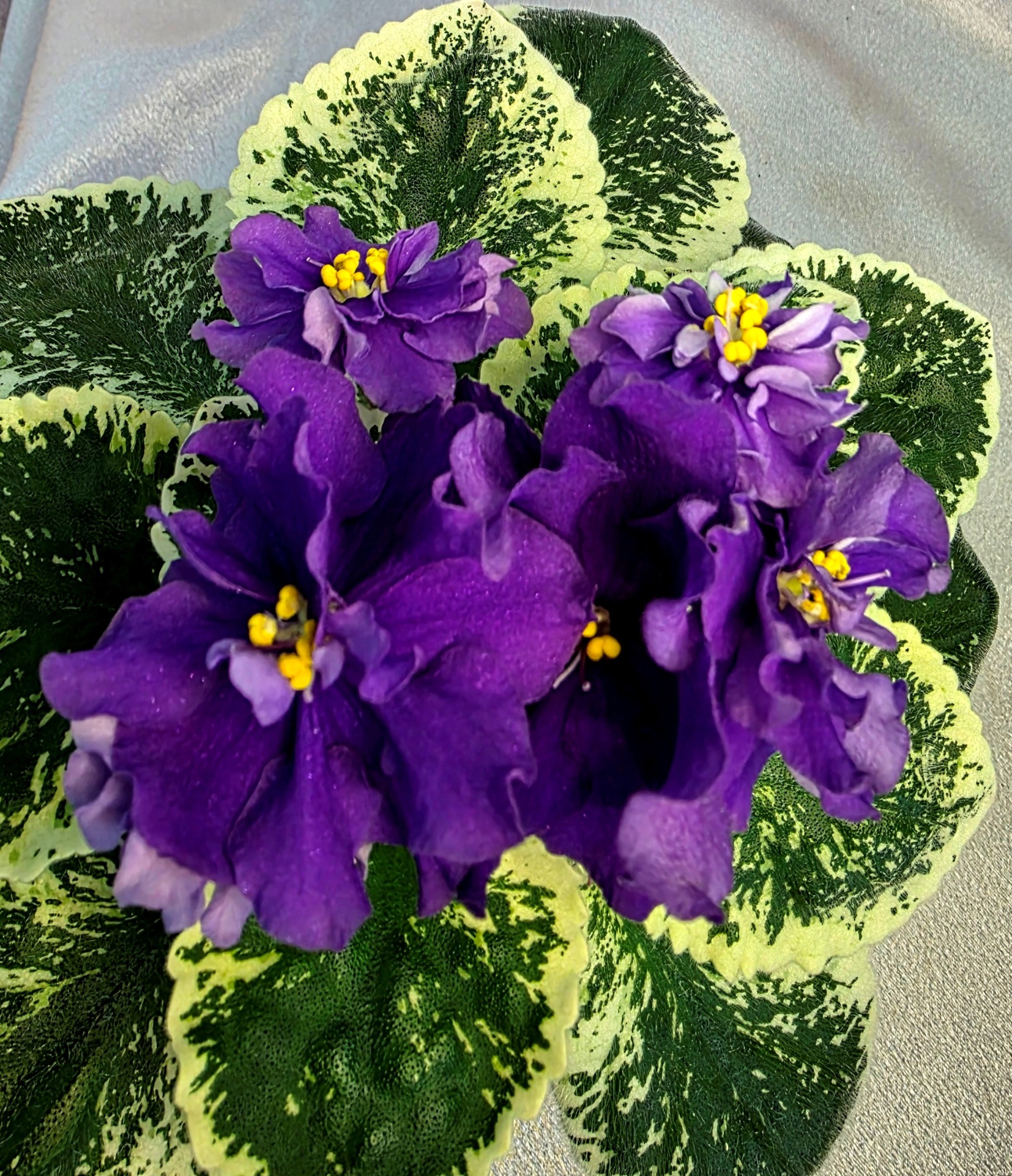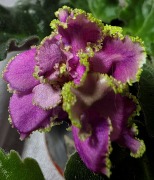 Обильнейший букет крупных анюток с почти белыми верхними лепестками, горохами белого фэнтази на нижних светло-аметистовых лепестках и гофрированным зеленым кантом по всему периметру цветка. Темный стеганый лист. Сорт с «изюминкой», очень нежный и очаровательный!